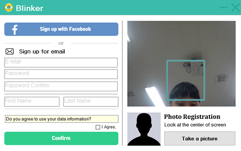 * 프로그램을 처음 시작할 때 뜨는 초기 화면이며 닉네임(ID)과 얼굴을 등록합니다. 여기서 얼굴 사진은 사용자의 눈 깜빡임 인식 정확도를 높이기 위해 사용되며 사용자 맞춤 데이터를 제공하기 위해 Azure DB에 저장할 닉네임을 설정합니다. 이는 프로그램 처음 실행 시 설정하면 다음에는 나타나지 않습니다.
