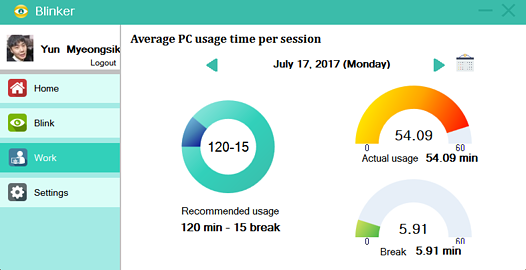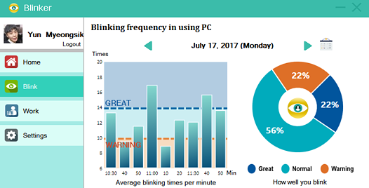 * 사용자 눈 깜빡임 분당 평균 횟수를 시간대별로 보여줍니다. 눈 깜빡임 횟수 데이터는 10회(컴퓨터 사용 시 평균 깜빡임 횟수와 평소 평균 깜빡임 횟수의 중간 값)를 기준으로 Great, Normal, Bad로 구분하여 도표에 보여줍니다. 사용자는 자신의 눈 깜빡임 습관의 좋고 나쁜 정도를 직관적으로 확인할 수 있습니다.사용자가 PC를 사용하는 시간과 휴식한 시간을 알려줍니다. 전문의들이 권장하고 있는 1회 작업당 컴퓨터 사용 시간과 휴식 시간(120분 작업, 15분 휴식)이며, 사용자의 실제 작업시간과 휴식시간 데이터입니다