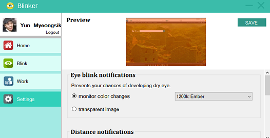 * 앞서 보여드린 각종 눈 깜빡임 유도 알림과 눈 운동 알림 등을 설정하는 화면입니다. 사용자는 원하는 방향에 맞추어 자유롭게 알림 종류와 알림 시간을 설정할 수 있으며 미리 보기(Preview) 창을 통해 알림이 어떻게 동작하는지 확인할 수 있습니다.