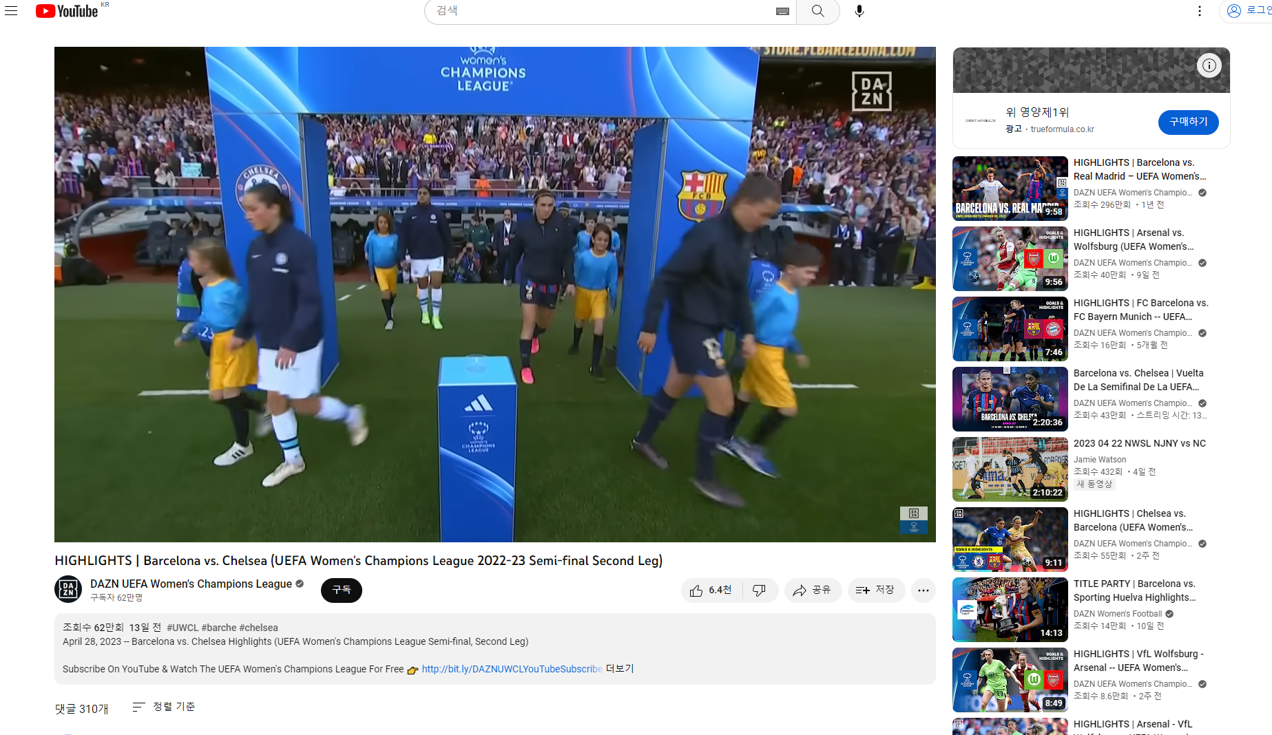검색 결과 중 원하는 동영상을 선택하면, 해당 동영상을 시청할 수 있습니다. 동영상 재생, 일시정지, 음소거