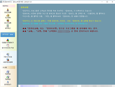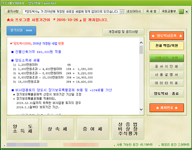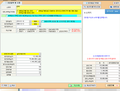 상세정보 다양한 자산에 대한 세액 계산 가능 * 1세대 1주택 적용시 도시계획구역 5배/10배 초과시 비사업용토지 계산지원합니다. * 양도횟수와 상관없는 합산계산 지원합니다. * 상업용건물/오피스텔 기준시가 계산지원합니다. * 감면세액을 자동으로 계산합니다. * 각종 산출근거의 인쇄가 가능합니다. 홈텍스 전자신고 지원 * 양도소득세및 증여세 전자신가 가능하니다.