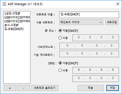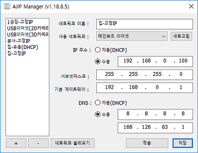 상세정보 손쉬운 사용법 * 네트워크 IP 변경이 어려운 초보자들도 쉽게 IP를 변경할 수 있는 환경을 제공합니다. IP 관리 * 고정IP(STATIC), 유동IP(DHCP) 및 보조DNS 변경 등의 다양한 환경을 지원합니다.