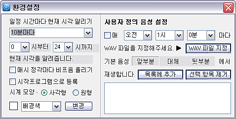 상세정보 시스템 트레이 아이콘에 현재 시각을 아날로그 형태로 표시합니다.일정 시간마다 음성으로 현재 시각을 알려줍니다.정각마다 비프음을 울리는 기능을 제공합니다.시스템 부팅시 자동 실행 설정이 가능합니다.