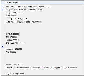 상세정보 항상위 기능 실행하고있는 파일을 항상 위에 보이도록 할 수 있습니다. 항상위 순서 항상위의 순서를 지정할 수 있습니다. 쉬운 인터페이스 너무 간단한 구성으로 쉽게 사용이 가능합니다.