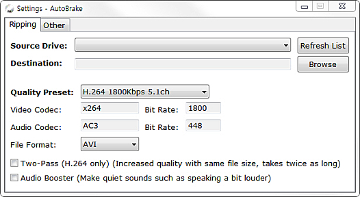 DVD 삽입 전에 Settings 메뉴에서 소스 드라이브와 결과물이 저장될 폴더를 지정할 수 있습니다.