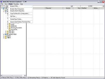 상세정보 오토캐드 파일인 DWG, DWT, BAK 등의 파일 버전 보기가 가능하고 Zip 파일로 압축 가능합니다. Tools탭을 클릭하고 Export Html을 클릭하면 오토캐드의 이미지 및 제목, 버전명, 제작 일자 등의 내용을 HTML 형식으로 볼 수 있으며, 저장 가능합니다.
