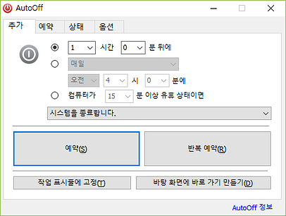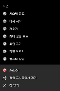 작업 표시줄의 AutoOff 아이콘에서 마우스 오른쪽 버튼을 클릭하면 AutoOff의 기능을 바로 실행할 수 있습니다.(Windows 7 이상)