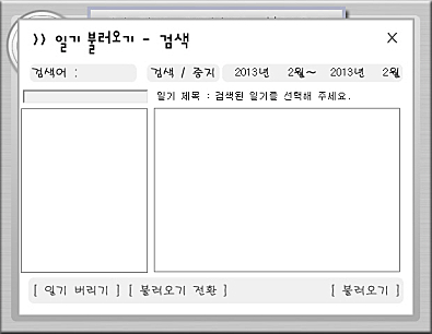 상세정보 일기장 기능 제작사 서버에 일기를 백업하여 언제든지 불러와서 쓸 수 있습니다. 사용자 기능 암호화 기능이 있어 한 프로그램으로 다수의 사용자가 서로에게 방해받지 않고 프로그램을 이용할 수 있습니다.