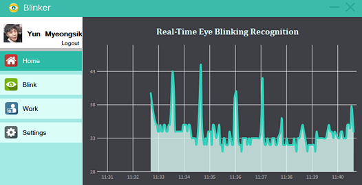 * 사용자 눈 깜빡임 분당 평균 횟수를 시간대별로 보여줍니다. 눈 깜빡임 횟수 데이터는 10회(컴퓨터 사용 시 평균 깜빡임 횟수와 평소 평균 깜빡임 횟수의 중간 값)를 기준으로 Great, Normal, Bad로 구분하여 도표에 보여줍니다. 사용자는 자신의 눈 깜빡임 습관의 좋고 나쁜 정도를 직관적으로 확인할 수 있습니다.사용자가 PC를 사용하는 시간과 휴식한 시간을 알려줍니다. 전문의들이 권장하고 있는 1회 작업당 컴퓨터 사용 시간과 휴식 시간(120분 작업, 15분 휴식)이며, 사용자의 실제 작업시간과 휴식시간 데이터입니다
