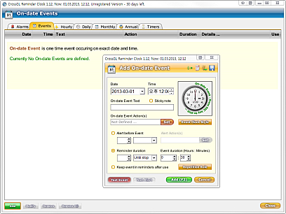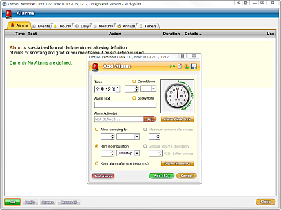 현재 날짜와 시간 확인은 물론 설정된 시간 경과시 메시지 창과 사운드 파일을 재생하는 알람 기능을 이용할 수 있습니다.