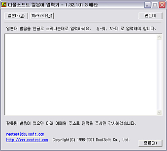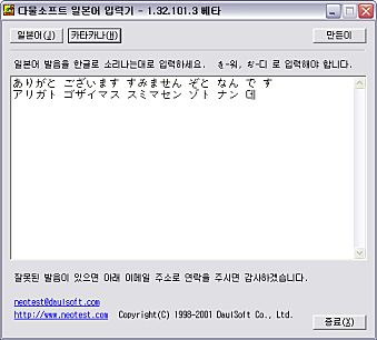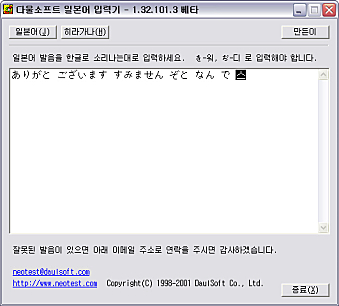 다울소프트 일본어입력기는 일본어 발음대로 한글을 입력하면 한글을 히라가나 또는 가타가나로 바꿔주는 프로그램입니다.