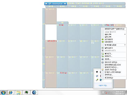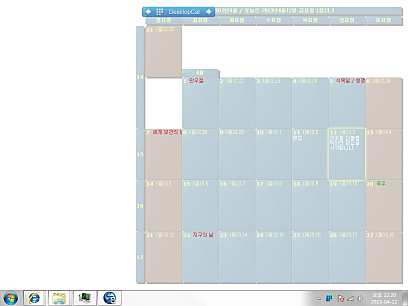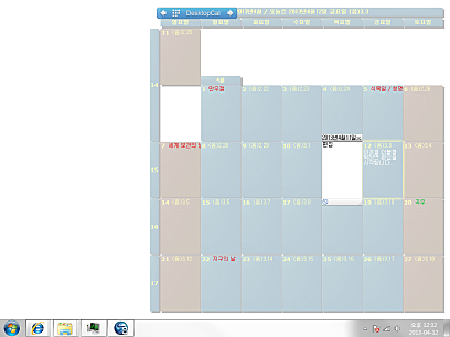 상세정보 달력 기능 * 윈도우 바탕화면에 동적인 달력을 설치하여, 일정관리, 약속관리, 메모장을 작성할 수 있습니다. 날짜를 더블 클릭하면 해당날짜에 대한 내용을 입력할 수 있습니다. 멀티 바탕화면 * 사용자가 지정한 바탕화면에 대하여, 설정된 시간 간격에 따라 자동으로 변경할 수 있습니다. 기타 옵션 * 한국어 지원합니다. * 디스플레이 설정에서 월별 최대 행, 주차 수, 셀의 색과 투명도를 조절할 수 있습니다.