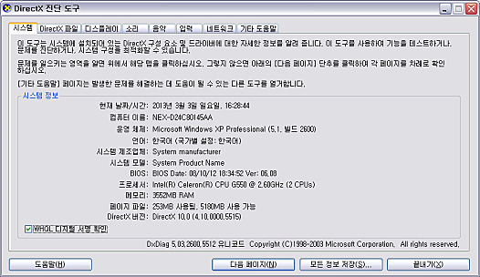 상세정보 DirectX 10 환경 및 정보 제공 Windows Vista 이하의 운영체제(Windows 2000, Windows XP) 환경에서도, DirectX 10를 사용하는 게임을 실행할 수 있도록 지원해 주며. DirectX의 등록 정보, 에러 상황의 정보를 제공합니다.