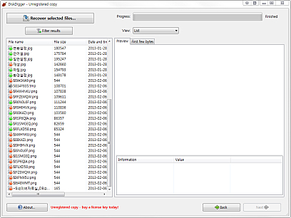 복구가 완료된 파일들은 해당 파일의 미리보기 및 정보가 노출됩니다. (JPG와 TIFF 파일의 EXIF 정보, MP3 의 ID3 태그, ZIP 파일의 파일목록 등)