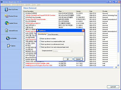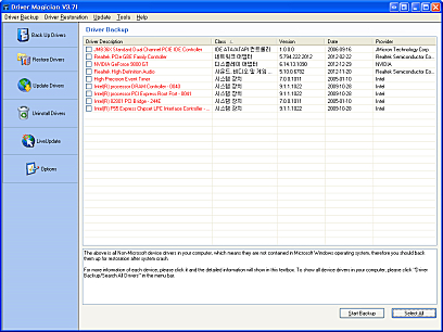 상세정보 백업 기능 시스템에 설치되어있는 비디오, 사운드, SCSI 드라이버들을 백업할 수 있습니다. 기타 쉽게 사용할 수 있게 쉬운 인터페이스로 구성이 되어있습니다. 원하는 드라이버를 선택하고 백업버튼만 누르면 손쉽게 드라이버들을 백업할 수 있습니다.