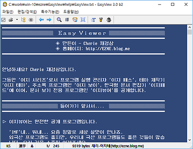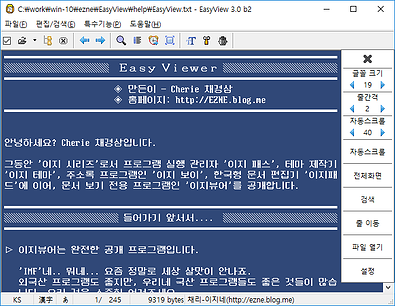 이지뷰어는 도스용 뷰어와 똑같이 모든 기능들을 단축키로 해결할 수 있으며, 도스용 뷰어에서만 지원했던 자동스크롤/아래한글 보기/글꼴 바꾸기등을 모두 지원하며, 그외에 줄간격/글자간격 조절기능까지도 지원합니다.