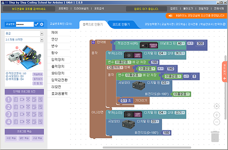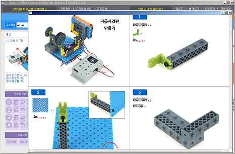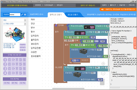 웹환경에서 DB화된 예제를 불러 간단하게 실습하는 제품으로써 아두이노 보드를 이용한 코딩 연습용으로 블록을 짜맞추듯 프로그램이 가능한 프로그램입니다.