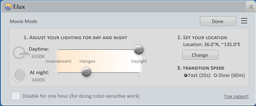 상세정보 f.lux는 당신의 컴퓨터 화면을 하루의 시간에 맞춰 밤에는 따뜻한 색깔로, 낮에는 햇빛과 같은 밝은 색을 연출해 줍니다. f.lux를 사용하면 밤에 잠도 더 잘 올 수 있으며, 컴퓨터 꾸미는데도 좋습니다.