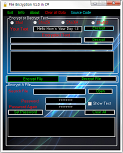 상세정보 암호화 기능 파일이나 TEXT를 SHA1, SHA256, SHA384, SHA512의 4가지 방식을 이용하여 암호화하거나 암호 해제할 수 있습니다. 텍스트 암호화 소프트웨어 실행 후 상단영역에서 텍스트를 암호화 하여 설정 또는 암호화 된 텍스트 해제가 가능합니다. 파일 암호화 소프트웨어 하단영역에서는 원하는 파일을 암호화 설정 또는 암호화 된 파일을 해제할 수 있습니다.