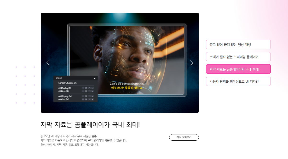 * 다양한 자막 파일 포맷을 지원하며, 자막이 없는 영상은 자막 자료실에서 최적의 자막을 빠르고 쉽게 다운로드 하여 감상하도록 해줍니다. 산돌폰트를 자막 글꼴로 설정하여 감상할 수 있습니다.