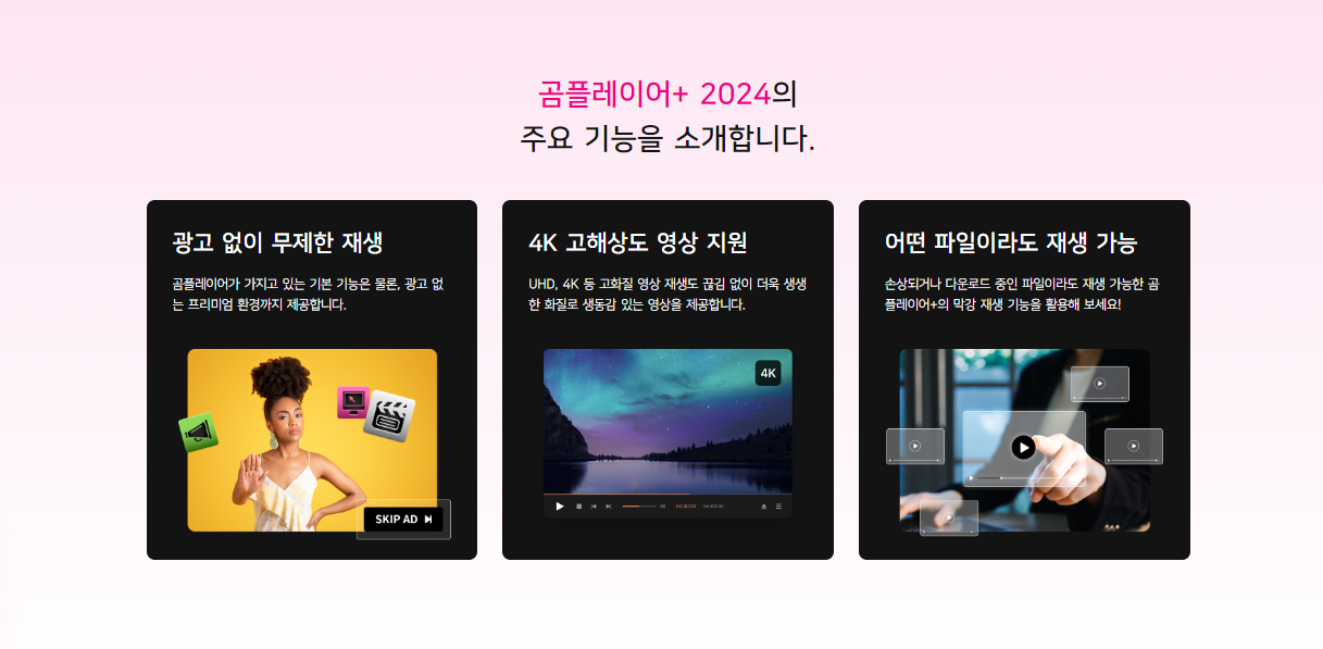 * 동영상 파일이 다운로드 중간에 끊기거나 손상된 경우 재생이 불가능한 경우가 많지만, 곰플레이어에서는 손상 부분을 복구하여 재생하도록 지원하고 있습니다.