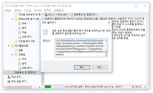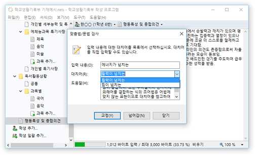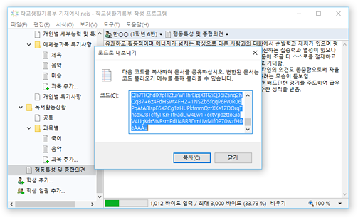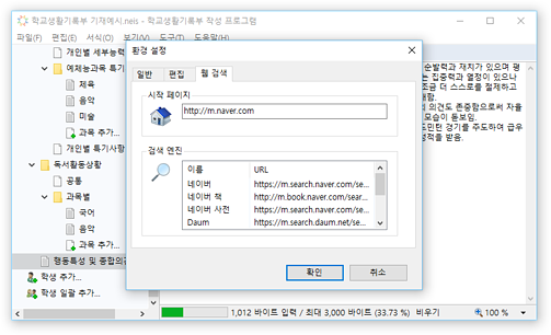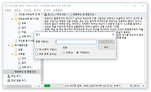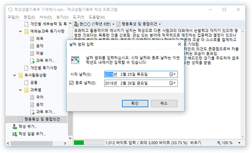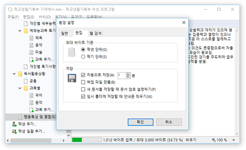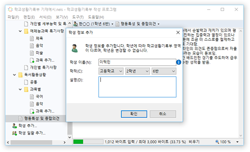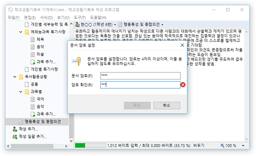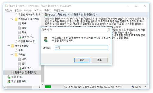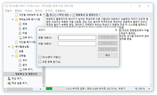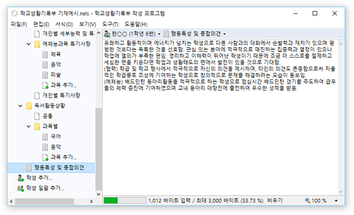 * 교육행정정보시스템(NEIS)의 바이트 계산 알고리즘을 통해 입력 내용의 바이트 수가 자동으로 계산되어 표시되므로, 입력 현황을 실시간으로 확인할 수 있습니다. 입력 가능한 바이트 수를 초과할 경우 경고가 표시됩니다.