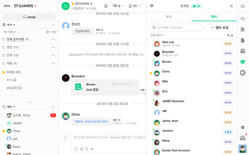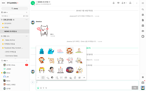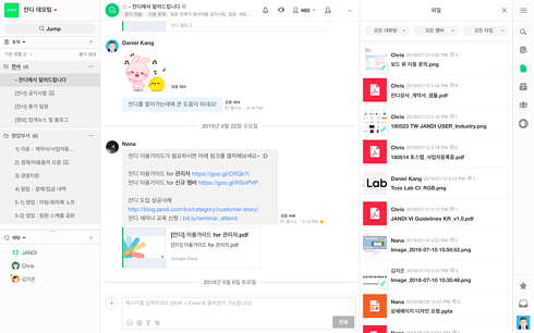 업무용 메신저 '잔디'는 메시지 전송, 파일 저장 및 공유, 메시지 및 파일 검색, PC 및 모바일 지원까지 업무에 필요한 기능을 모은 서비스 프로그램입니다.