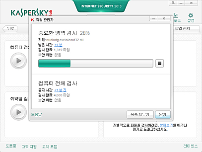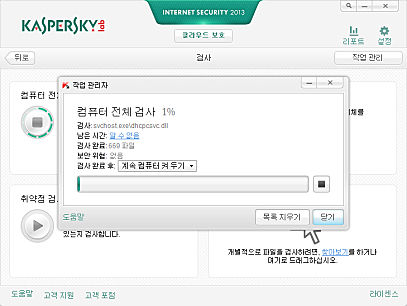 * Kaspersky Internet Security 2013이 배터리 전원으로 실행되는 노트북에 설치되면 사용 시간을 늘리기 위해 자동으로 리소스의 사용을 줄입니다.