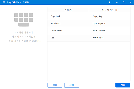 상세정보 * 사용하지 않는 키나 오동작을 일으킬수 있는 키를 비활성화 시키거나 다른 키로 변경을 할수 있는 프로그램입니다. * 계산기나 탐색기, 웹브라우져를 호출하는 키로 변경하여 유용하게 사용할수 있습니다.