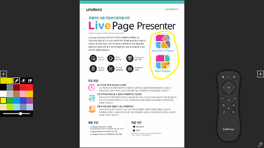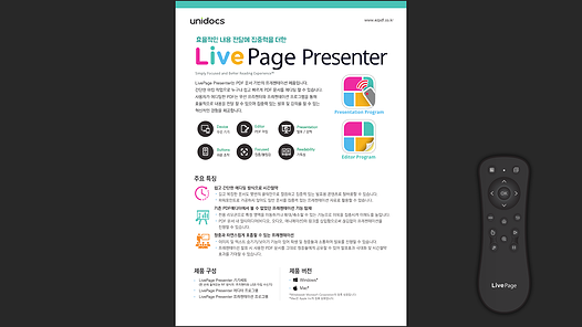 라이브페이지프레젠터에디터로 제작한 발표/강의용 PDF문서를 열람 또는 프레젠테이션 모드로 전용 리모콘으로 쉽게 조작하며 집중과 가독성을 높인 신개념 프레젠테이션 프로그램입니다.