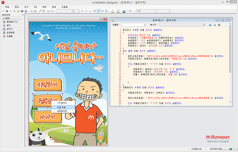 * m-BizBuilder에서는, 전체 프로그래밍 작업량의 약 98%를 순수한 GUI Tool에 의해서 아무런 코딩작업 없이 구현합니다. 나머지 약 2%에 해당하는 업무규칙, 거래조건, 동적작동 등과 같은 비즈니스 로직 부분은 보통 사람들이 일상적으로 사용하는 한글(또는 영문) 자연어를 사용함으로써, 코드와 코딩이라는 개념을 완전하게 제거하였습니다. 따라서 프로그램 언어를 공부해본 경험이 없는 사람들도 아주 쉽게 사용할 수 있으며, 타인이 작성한 로직도 즉시 해석할 수 있어, 추가적인 설명이나 다큐먼트 작업이 필요없는 개발환경을 실현했습니다.