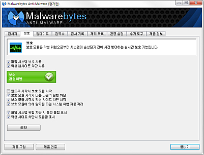 악성코드 및 맬웨어의 위협으로부터 시스템이 손상되기 전에 사전 방어하는 실시간 보호 기능입니다.