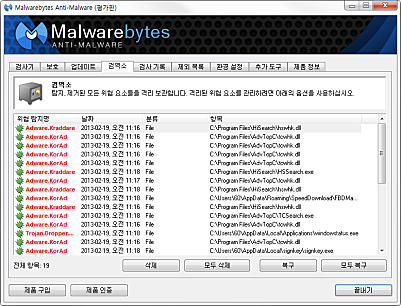 탐지, 제거된 모든 위협 요소들을 격리 보관합니다. 격리된 위협 요소들은 여러 가지 옵션(삭제, 모두 삭제, 복구, 모두 복구)을 통하여 관리할 수 있습니다.