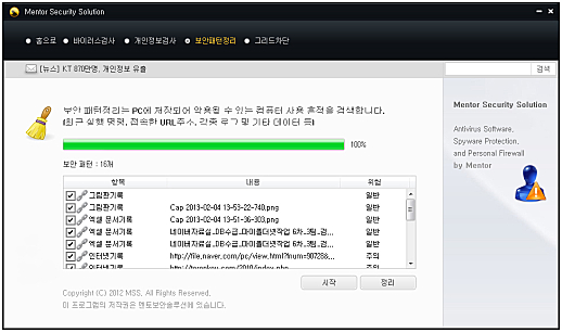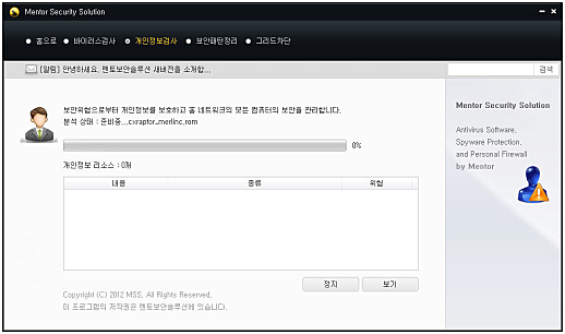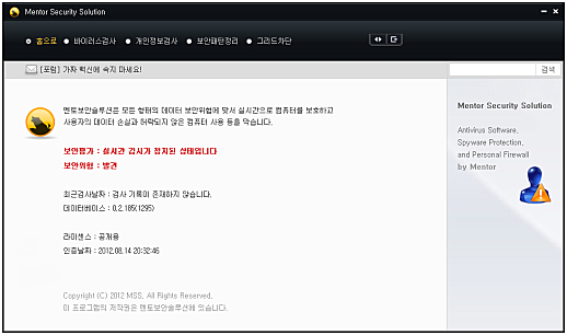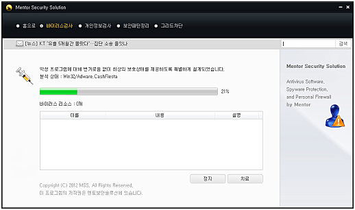 상세정보 바이러스 검사 애드웨어, 스파이웨어, 바이러스 등의 악성코드 검사를 실시합니다. 시스템 최적화 기능 불필요 파일검사 및 레지스트리 정리등의 시스템 최적화 기능을 제공합니다. 자동 업데이트 기능 DB 및 프로그램 업데이트등 업데이트를 자동으로 실시합니다. PC관리 기능 PC정보 및 시작 프로그램 관리, BHO 및 ActiveX 차단 기능등 컴퓨터 관리에 필요한 여러 가지 기능을 제공합니다.