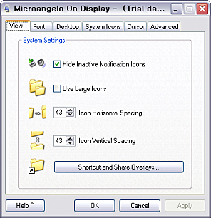 상세정보 데스크톱에 보이는 아이콘의 크기, 간격과 폰트의 색상, 종류 등의 설정을 변경할 수 있습니다. 마우스 커서를 변경할 수 있습니다. 프로그램을 시스템 트레이 창에 둘 수 있습니다. 변경한 설정들을 원래대로 되돌릴 수 있습니다.