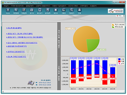[계좌통합] 기능과 [가계부] 기능이 하나로 통합된 국내 유일의 프로그램입니다. 머니북은 기획/설계에서부터 모든 기능이 하나로 통합되어 만들어져 있어 [계좌통합] 기능에 의해 가져온 자료를 가계부에 연결하는 작업을 할 필요 없이 바로 이용이 가능합니다.