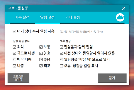 * 또한, 세부 알림 설정을 통해 공기가 매우 좋을때, 혹은 매우 나쁠때에만 알림을 받으실수도 있습니다.