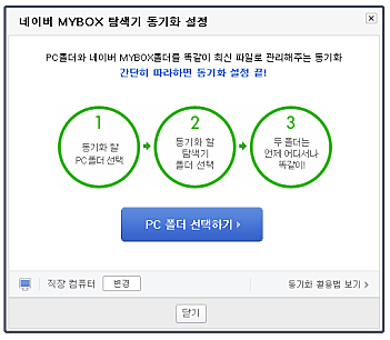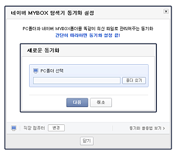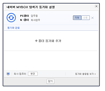 * 자동 동기화 기능을 통해서 PC에서 지정한 폴더를 네이버 MYBOX와 동일하게 유지할 수 있습니다.