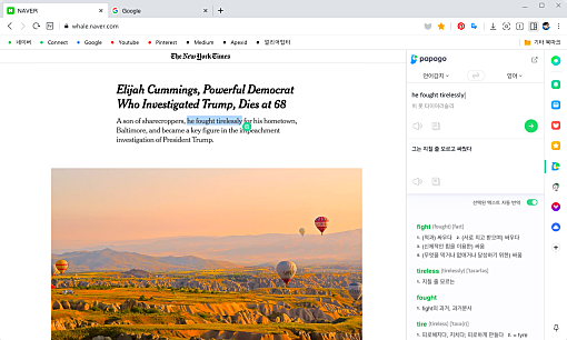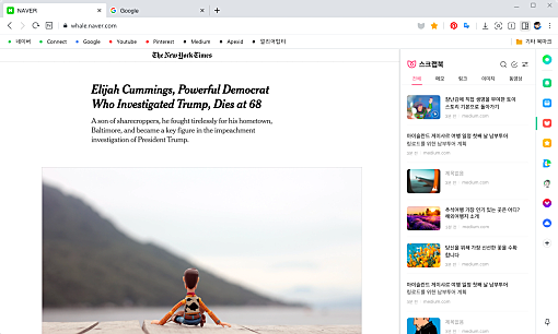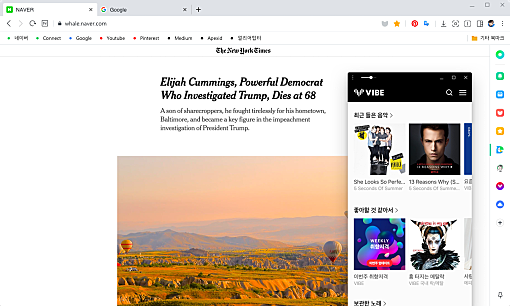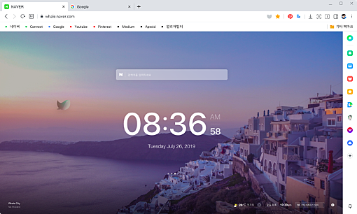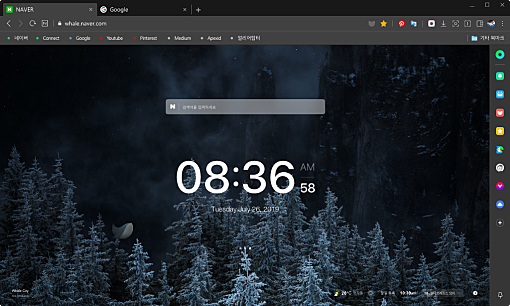 * 계산기, 타이머 등 필요한 도구는 바로 꺼내 쓰고, 파파고 번역과 뮤직 플레이어도 사용할 수 있는 웨일 ‘사이드바’로 편리한 웹 서핑을 즐기세요.