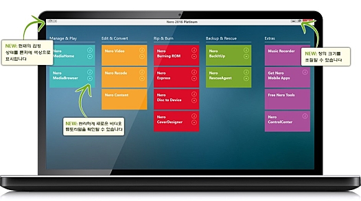 Nero 2016 Platinum으로 음악 CD, 영화 DVD 및 블루레이 디스크, 가족 행사의 기념 사진, 스마트폰으로 촬영한 파티 사진을 굽기, 복사, 제작하고, 좋아하는 미디어 파일 및 컨텐츠 백업해 보세요. 새로운 디자인과 프린트 템플릿을 사용하여 자신만의 DVD, 오디오 CD 케이스를 꾸며 보세요.