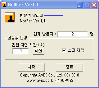 상세정보 방문객 카운터기 Notifier Ver1.1 노트북 또는 PC를 방문객 카운터기로 사용 노트북이나 PC로 F12 키를 눌러 방문객 카운터로 사용할 수 있습니다. 인체감지센서 스위치로 방문객 알림 기능 인체감지 센서 스위치와 UID200 키보드를 연결하여 방문객이 있을 경우 팝업으로 알려줍니다. 방문객 방문시간, 방문 횟수를 로그 파일에 저장하여줍니다.