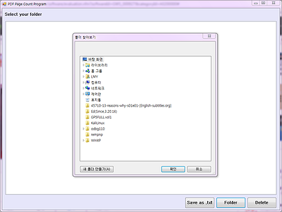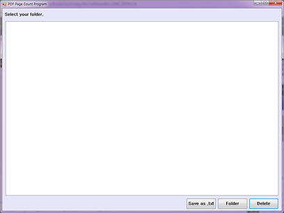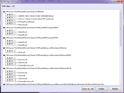 상세정보 Save as .txt * 표시된 PDF 파일의 페이지 수를 사용자가 지정한 경로에 텍스트 파일형태로 저장합니다. Folder * 사용자가 PDF 파일들을 검색하기 위해 폴더를 선택합니다. Delete * 화면에 표시된 PDF파일의 경로, 파일명, 페이지 수를 삭제합니다.