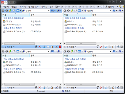 Q-디렉토리에서 파일 관리는 Microsoft Windows 탐색기이지만, 4개의 창으로 더 많은 기능을 사용할 수 있습니다.