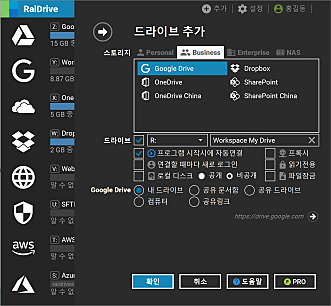 * 구글 드라이브, 구글 팀드라이브, 구글 포토, 원드라이브, 드롭박스 뿐만아니라 NAS, 공유기와 같은 원격 스토리지를 윈도우즈 네트워크 드라이브로 만듭니다.