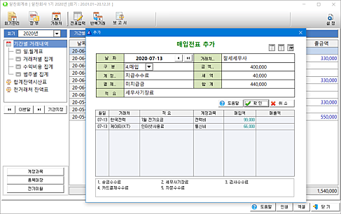 * 매입매출전표입력에서 매입, 매출 구분과 결제선택으로 자동분개(복식부기)를 지원합니다.