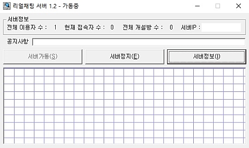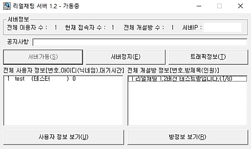 * 방목록보기/인원목록보기 버튼을 이용하여 현재 서버에 접속해 있는 사람 혹은 개설되 있는 방들을 볼 수 있습니다.