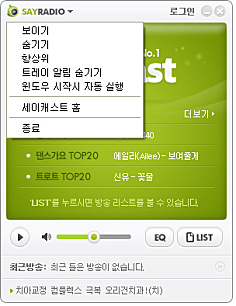 세이라디오를 작업표시줄 트레이에 넣어두고 가볍게 사용할 수 있습니다.