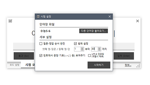 * sayThatWord는 테스트를 치기 전 정답을 보고 들으며 따라 입력할 수 있는 연습 모드를 지원합니다. 또한 순서를 통해 단어를 외우지 않도록 순서를 무작위로 섞어 테스트를 진행할 수도 있으며, 범위를 나눠 시험을 칠 수도 있습니다.