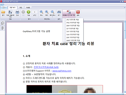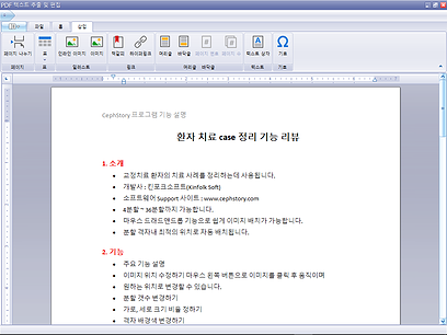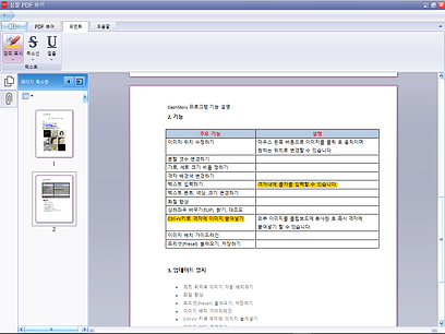 상세정보 뷰 및 인쇄 * PDF 파일을 읽어 들여 화면에 출력해 보여주고, 인쇄를 할 수 있습니다. * 인쇄 미리보기 화면을 통해 인쇄할 내용을 시각적으로 확인할 수 있는 강력한 WYSIWYG 이 제공됩니다. 간단한 편집 * 페이지 회전, 강조 표시, 밑줄, 취소선, 말풍선, 텍스트 검색 등을 할 수 있습니다.