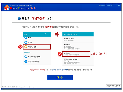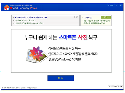 상세정보 스마트폰 사진 복구 * 삼성,LG등 안드로이드 계열 스마트폰의 사진 복구를 지원합니다. *초기화된 스마트폰은 복구되지 않습니다 누구나 쉽게 * 회원가입 없이 전문 지식이 없어도 쉽게 복구작업이 가능합니다.*PC와 스마트폰 연결이 필요합니다. 안드로이드8.0 지원 * 삼성 갤럭시 노트8등 최신폰 지원합니다.
